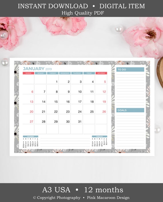 A3 Desk Calendar 2019 Template Printable Modern Desk Planner Instant Download C2