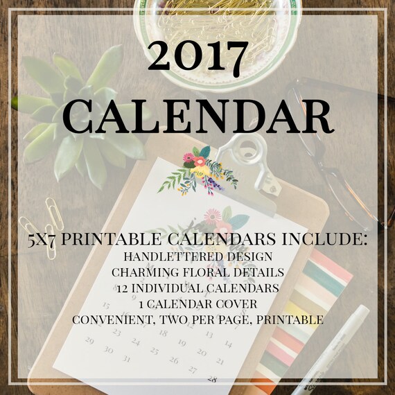 2017 Calendar Printable Calendar 5x7 Calendar Desktop Calendar Floral Calendar Handlettering Printable