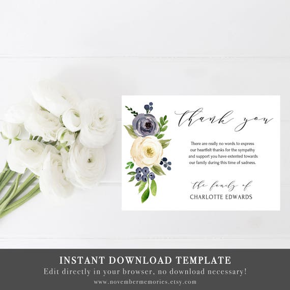 Memorial Thank You Cards Thank You Notes Funeral Card Template Thank You Cards Printable Bereavement Card Sympathy Acknowledgment Editable