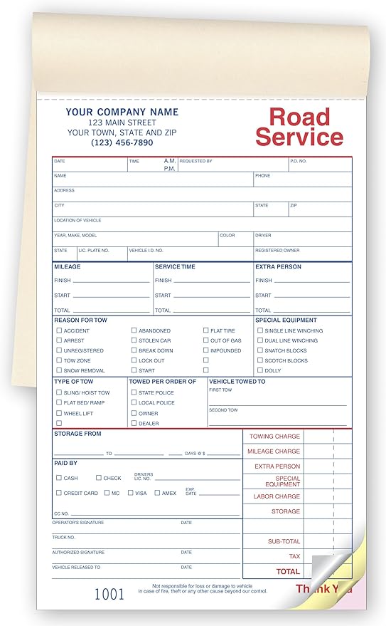 Checksimple Tow Truck Towing Service Order Forms Customized Small Receipt Book Format 2 Part White 250 Forms