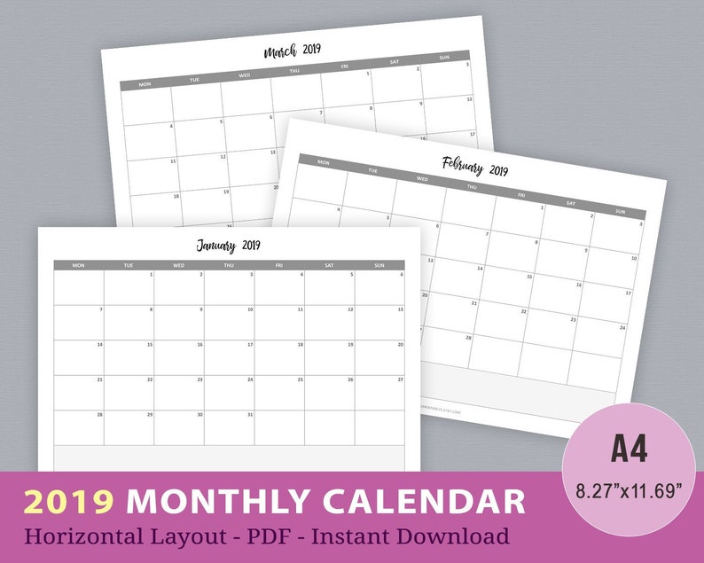 Monthly Calendar 2019 Printable Blank Monthly Planner Sunday Monday Start 2019 Calendar Pages Instant Download Digital Download Pdf A4